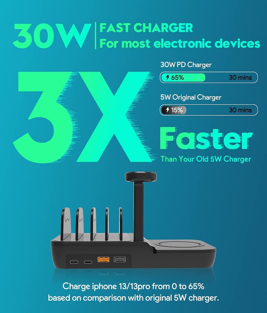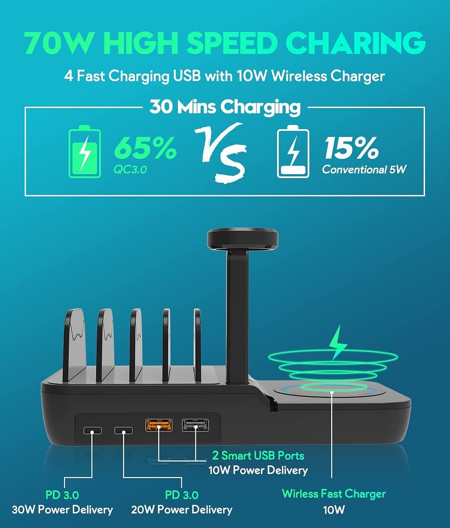 【5 in 1 Charging Station】Charging Station with QC Compliant AC Adapter Built-in with 2 Smart USB-A Ports and 2 Smart USB-C Ports and 1 Watch Stand (Apple Watch Cable Not Included): 2 USB-C and one USB-A1 port can deliver up to 5V/3A maximum current at full speed, and one USB-A2 port can deliver up to 5V/2A maximum current at full speed. The 70W charging station can charge 4 devices, the 4 ports have a maximum power of 60W, and the wireless charger has a power of 10W.- 【Power Delivery & QC 3.0 USB-C Ports】Fastest Charging Technology – MACRRO’s 4-port USB Charger Station has built-in USB C Power Delivery and QC 3.0 to quickly charge your electronic devices up to 100%. Among them, the PD USB-C port is up to 30W, which is suitable for fast charging of electronic devices such as tablets and large smartphones.