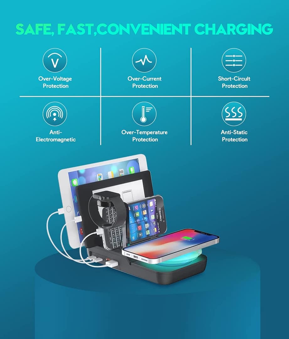 - 【10W Wireless Charger】The wireless charging station’s adaptive charging mode can provide your device with the power it needs, the wireless charger supports 10W fast charging. Its charging distance can reach 3-8mm, with a better induction function. The charging station is protected against overcharging, overcurrent, and short circuits, and has passed the certification of professional laboratories in the United States.